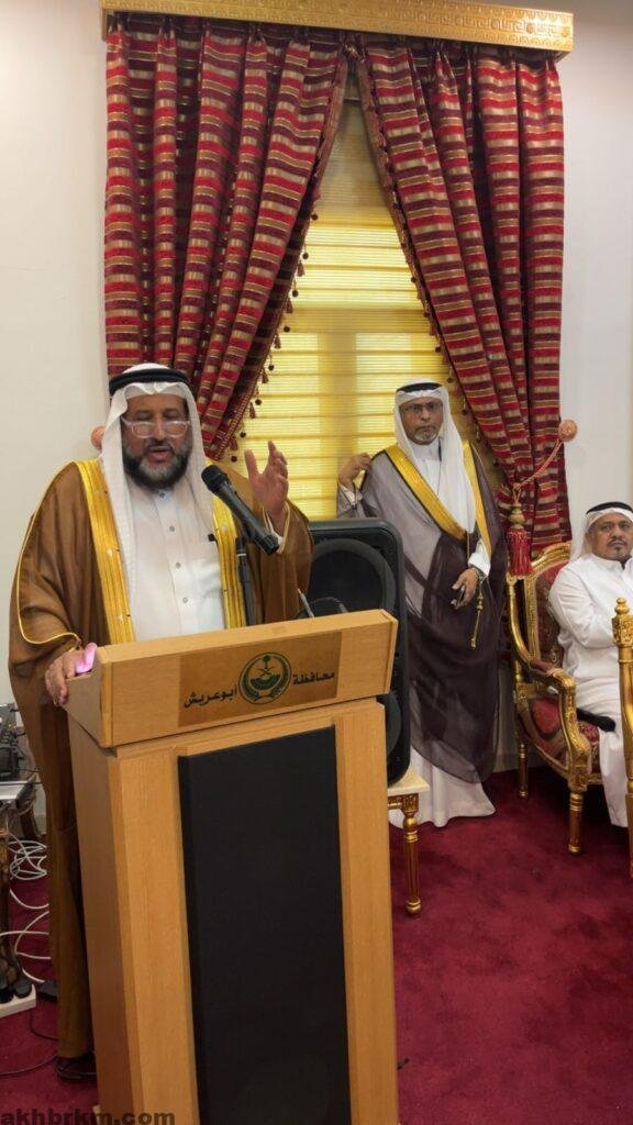 وألقى الشيخ أحمد بن محمد الحمزي، عضو مؤسس بمكتب متقاعدي أبوعريش، كلمة نيابة عن أهالي ومشايخ وأعيان ووجهاء المحافظة، قدّم خلالها التهنئة للقيادة الرشيدة، مشيرًا إلى أهمية العيد في تعزيز روح المحبة والتآلف بين أفراد المجتمع. كما نوّه بالدور الكبير الذي تقوم به محافظة أبوعريش، ممثلة في سعادة المحافظ الأستاذ شاهر بن شهاب الجنفاوي، وسعادة وكيل المحافظة الأستاذ عبده بن محمد مجرشي، في دعم التنمية وتحقيق مستهدفات رؤية 2030.