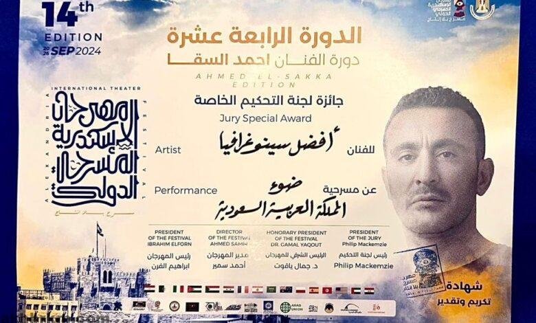 في انجاز جديد يضاف الى الانجازات الثقافية السعودية حصدت فرقة مسرح الطائف جائزة السينوغرافيا في ختام مهرجان الإسكندرية المسرحي الدولي في دورته الرابعة عشر دورة الفنان احمد السقا عن العرض المسرحي مسرحية ضوء من كتابة عراب المسرح السعودي الاستاذ فهد رده الحارثي واخراج الاستاذ احمد الاحمري وسط حضور جماهيري كثيف من المسرحيين وعشاق المسرح من مختلف دول العالم