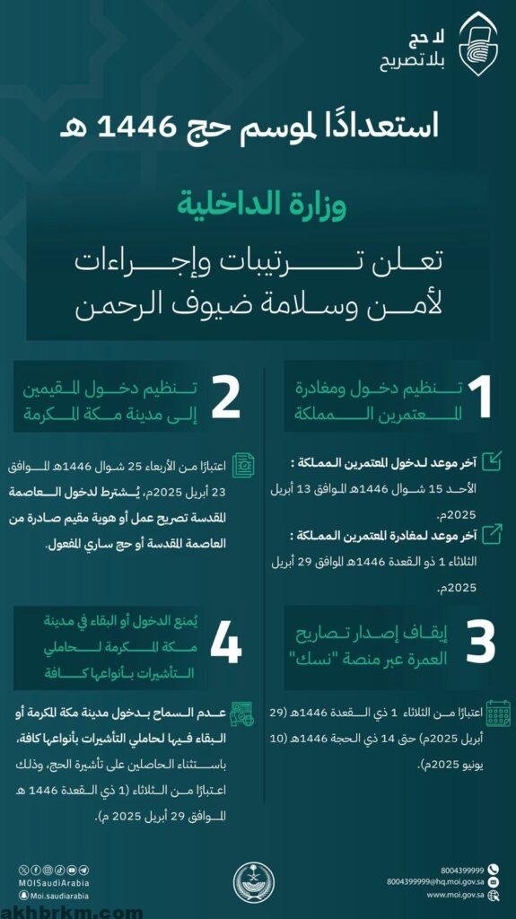أعلنت وزارة الداخلية عددًا من الترتيبات والإجراءات التنظيمية والأمنية، استعدادًا لموسم حج هذا العام 1446هـ، وذلك بهدف ضمان سلامة ضيوف الرحمن وتيسير أدائهم لمناسك الحج بأمن وطمأنينة. وشملت الترتيبات المعلنة ما يلي: