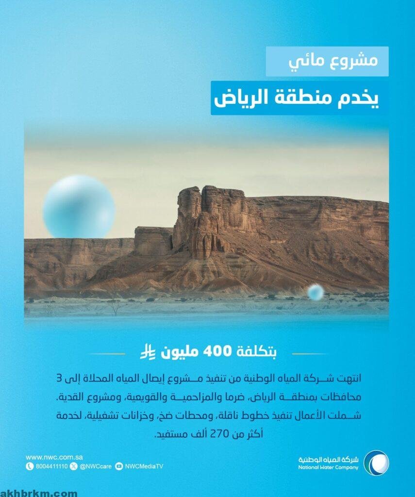 أعلنت شركة المياه الوطنية، ممثلة بقطاعها الأوسط، عن الانتهاء من تنفيذ مشروع إيصال المياه المحلاة إلى محافظات ضرما والمزاحمية والقويعية، إضافة إلى مشروع القدية غرب مدينة الرياض، وذلك ضمن جهودها المستمرة في تعزيز البنية التحتية لقطاعي المياه والخدمات البيئية، وبدعم من وزارة البيئة والمياه والزراعة، بتكلفة إجمالية تجاوزت 400 مليون ريال.