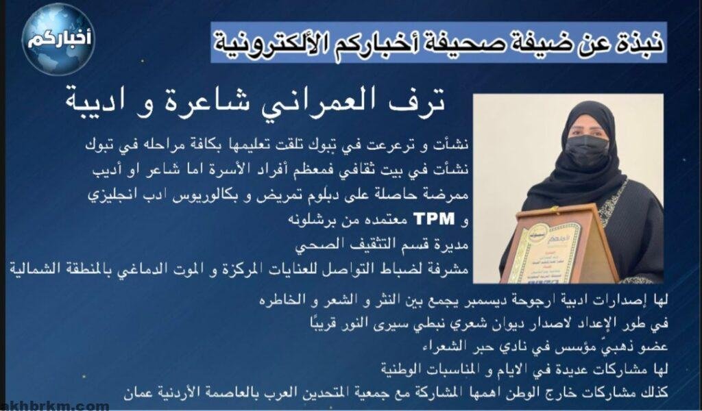 انضمت الاستاذة ترف العمراني كمنسق ومديرآ للعلاقات العامة بصحيفة اخباركم الألكترونية ومشرفاً علي نادي تواصل الثقافي بمنطقة تبوك .
