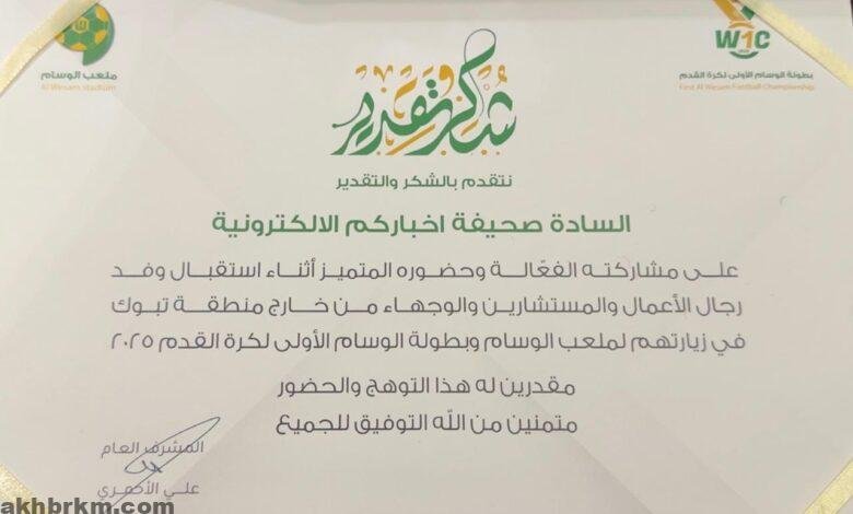 في بادرة تقديرية، كرّمت بطولة الوسام الأولى لكرة القدم صحيفة “أخباركم” الإعلامية نظير مشاركتها الفاعلة وتغطيتها المتميزة لفعاليات البطولة، وذلك خلال استقبال وفد من رجال الأعمال والمستشارين والوجهاء القادمين من خارج منطقة تبوك، في زيارتهم لملعب الوسام.
