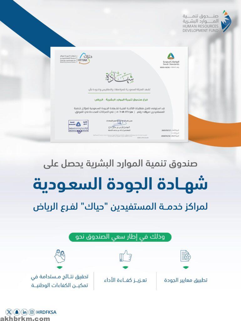 حصل فرع صندوق تنمية الموارد البشرية (هدف) في مدينة الرياض على شهادة الجودة السعودية لمراكز خدمة المستفيدين “حياك”، الصادرة عن الهيئة السعودية للمواصفات والمقاييس والجودة، وذلك تقديرًا لالتزامه بتطبيق أفضل الممارسات الوطنية والعالمية في الجودة والتميز المؤسسي.