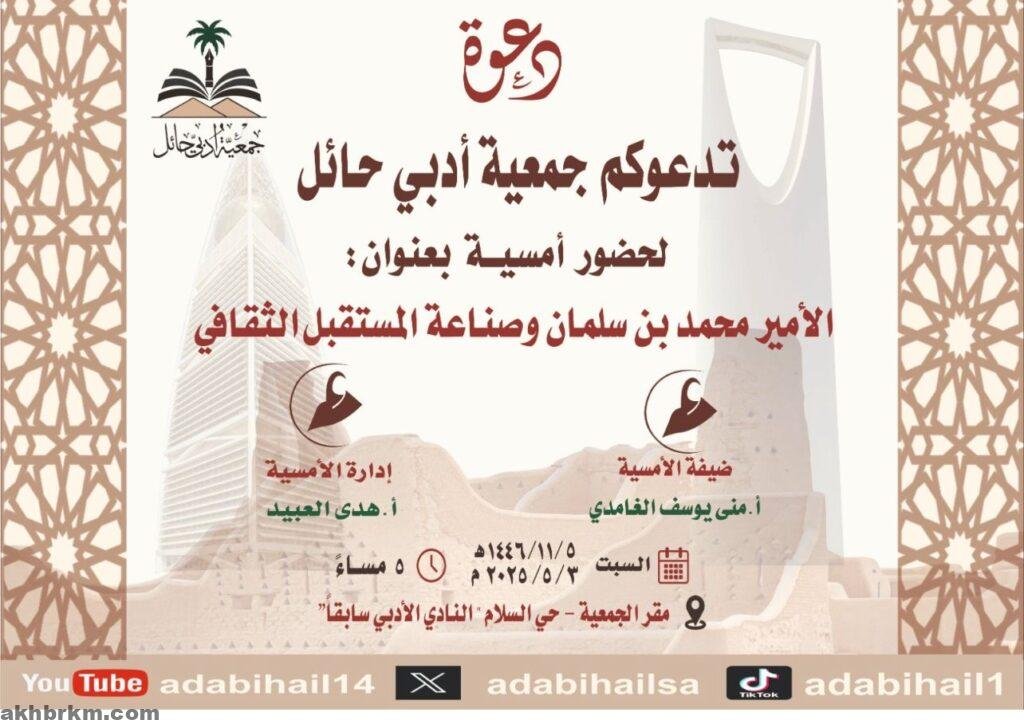 جمعية أدبي حائل تنظم مساء اليوم أمسية بعنوان“ الأمير محمد بن سلمان وصناعة المستقبل الثقافي”
