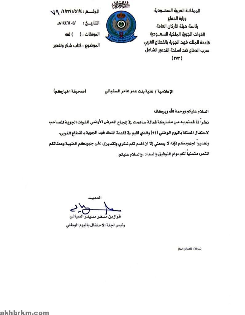 كرمت القوات الجوية الملكية السعوديه بمنطقة الطائف الإعلامية غنية بنت عمر السفياني في صحيفة “اخباركم” الاعلاميه لمشاركتها الفعالة التي ساهمت في انجاح المعرض الأرضي للقوات الجوية والمصاحب لاحتفالات المملكه باليوم الوطني 94 والذي أقيم في قاعدة الملك فهد الجوية بالقطاع الغربي . نظير جهودها الصحفيه المتميزة في إبراز أنشطة فعالية اليوم الوطني .