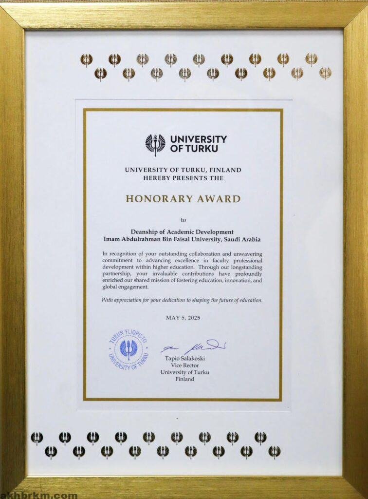 جامعة الإمام عبد الرحمن بن فيصل تحصد الجائزة التقديرية من جامعة توركو الفنلندية تقديراً لتميّزها في تطوير التعليم