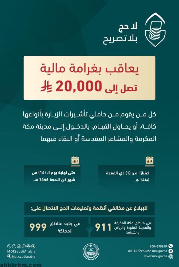 أكدت وزارة الداخلية بدء تطبيق غرامات مالية تصل إلى 20,000 ريال على حاملي تأشيرات الزيارة بأنواعها كافة، في حال دخولهم أو محاولتهم دخول مكة المكرمة والمشاعر المقدسة أو البقاء فيها، وذلك اعتبارًا من غرة ذي القعدة وحتى نهاية 14 ذي الحجة.