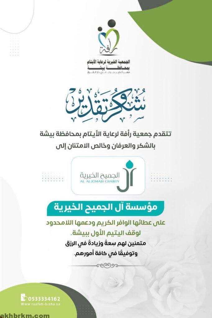 جمعية “رأفة” تُثمّن دعم مؤسسة “آل الجميح” الخيرية لوقف اليتيم الأول بمحافظة بيشة