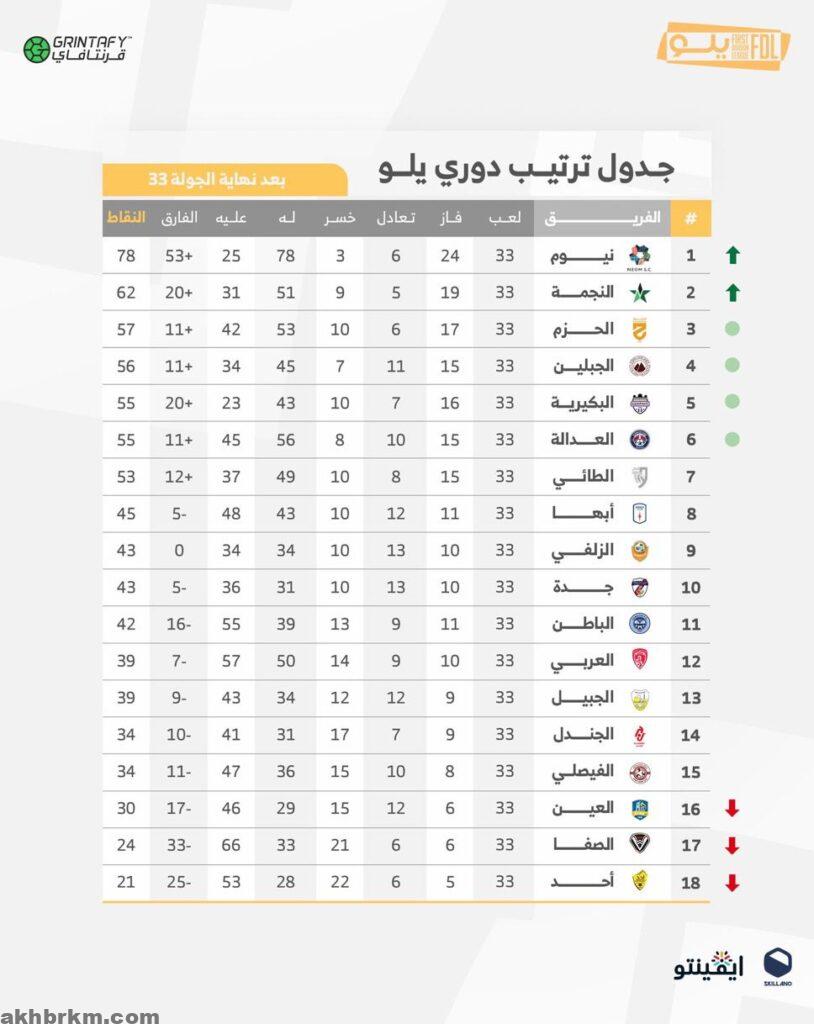 ختام الجولة الـ33 من دوري ” يلو ” …. نيوم والنجمة …. إلى دوري روشن وصراع محتدم على البطاقة الثالثة