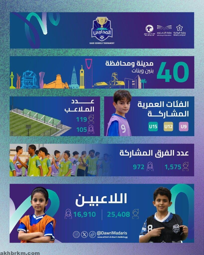 ويشارك في الدوري أكثر من 42 ألف طالب وطالبة من 1,575 مدرسة للبنين و972 مدرسة للبنات، ويُجري المباريات على 224 ملعبًا رياضيًا موزعة بين 119 ملعبًا للبنين و105 ملاعب للبنات، مما يُظهر حجم المشاركة والإقبال على هذه البطولة من مختلف أنحاء المملكة.