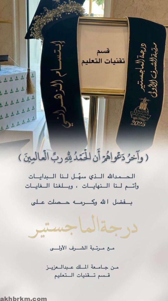 حققت الأستاذة ابتسام الزهراني إنجازاً أكاديمياً لافتاً بحصولها على درجة الماجستير في تقنيات التعليم من جامعة الملك عبدالعزيز، وذلك بمرتبة الشرف الأولى، تتويجاً لمسيرة علمية حافلة بالاجتهاد والمثابرة.
