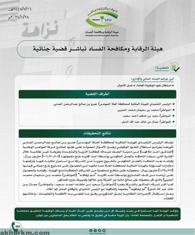 صرح مصدر مسؤول في هيئة الرقابة ومكافحة الفساد بأنه تم إيقاف الرئيس التنفيذي للهيئة الملكية لمحافظة العلا، المهندس عمرو بن صالح عبدالرحمن المدني؛ لتورُّطه بجرائم استغلال النفوذ الوظيفي وغسل الأموال؛ لحصوله على عقود لصالح شركة المواهب الوطنية (المذكور أحد مُلاكها) من مدينة الملك عبدالله للطاقة الذرية والمتجددة بطريقة غير نظامية، خلال الفترة التي سبقت التحاقه بالعمل الحكومي بواسطة أحد أقاربه، بلغ مجموعها (206.630.905) مائتين وستة ملايين وستمائة وثلاثين ألفًا وتسعمائة وخمسة ريالات،