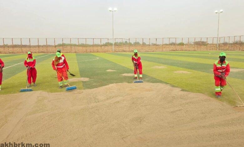 وتباشر فرق النظافة الميدانية أعمالها في 6 ملاعب بالقرى التابعة، شملت ملاعب: الباطنة، الكدمي، الملحاء، المحلة، أبو السلع، واللخباصية، إضافة إلى ملعبين رئيسيين في المدينة، وذلك عبر أعمال الكنس وإزالة الأتربة لضمان جاهزيتها.